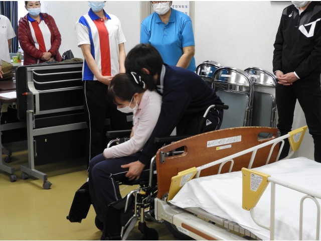 最後に、実際にベッドと車いすを使って、転倒・転落リスクの高い利用者様の状況を想定し、ケア技術の確認を行いました。少しでも利用者様に安全に安心して過ごしていただくため、これからも頑張ります(^0^)V