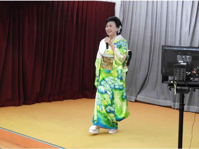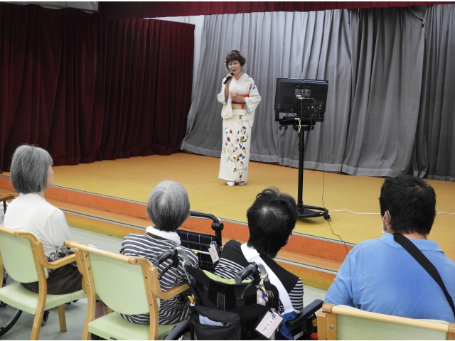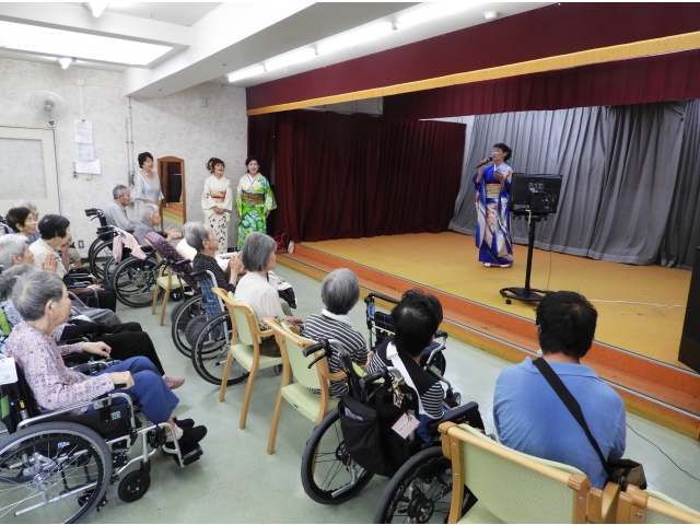 7月16日(火)、すみれ会がお越しになりました。綺麗な着物姿で、利用者に聞きなじみのある懐かしい曲を10曲歌っていただきました。多くの利用者が口ずさんだり、手拍子をしたり等楽しい時間となりました。次回も楽しい時間を一緒に過ごせたらと思います