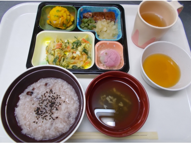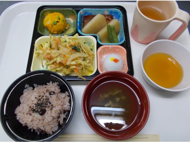 11月はリクエストにお応えし、さつま芋のかき揚げ、角煮、南瓜サラダ、お饅頭を提供しました。