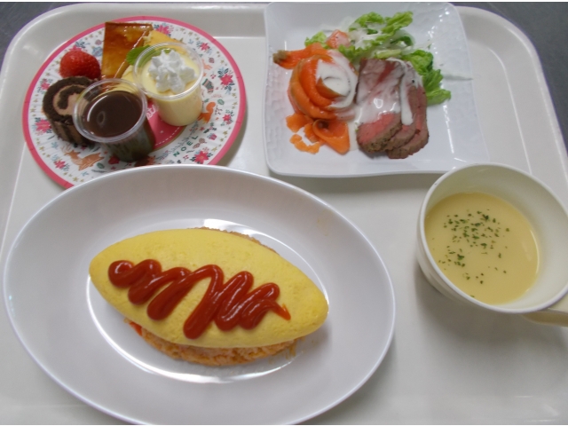 昼食は、オムライス、ローストビーフとサーモンのサラダ、コーンスプーンです。オムライスはご利用者からの希望でもあり、とても喜んでいただけました。