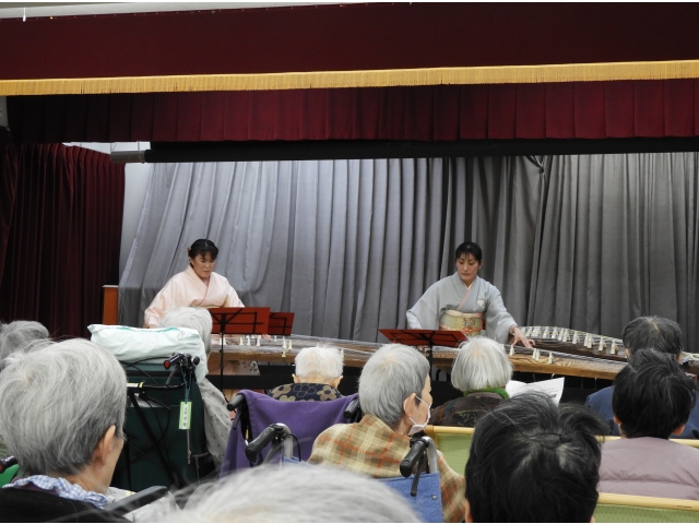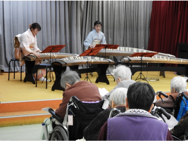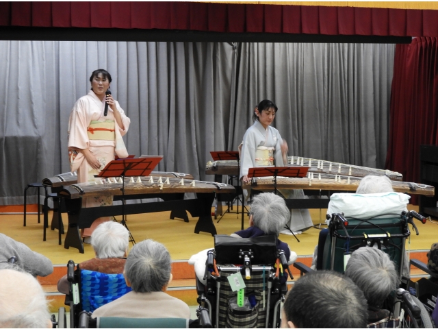 1月17日に生田流の演奏者2名が来苑され、演奏会を開催しました。新春にふさわしい年初めの唄、懐かしい小学生唱歌や青い山脈など耳なじみのある曲を披露して頂きました。琴の音色に利用者のみなさまは聞きほれていました。今後も来苑してもらい、美しい琴の音色を届けてもらいたいです。