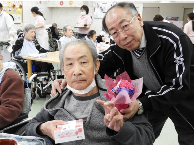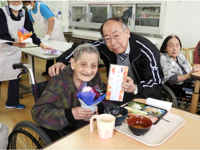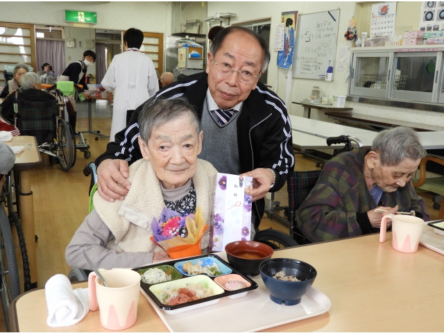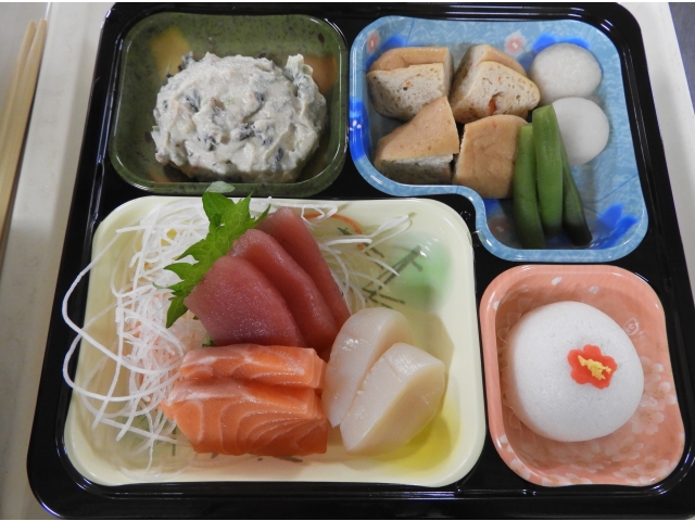赤飯と刺身の盛り合わせはとても人気があり、たくさんのご利用者から「美味しかった」との声をいただきました。また12月に入所され、今回初めての誕生会に参加された方からは、「刺身が食べられるとは思わなかった」と、とても喜んでいただけました。 1月29日はカニ鍋を提供しますので、楽しみにお待ちください。