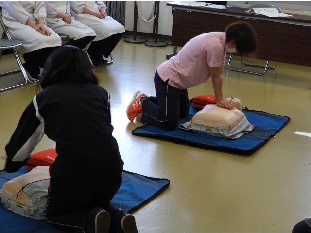 令和2年1月29日、当苑におきましてAEDと人形を使用した救命訓練を実施しました。愛西市消防本部から職員を派遣していただき、60分という短い時間ではありますが参加された職員18名全員、真剣かつにこやかにAEDの取り扱い、胸部圧迫と実践しました。 その成果があって充実した内容で実のある講習会となりました。 この取り組みを実践に生かしたいものですね!
