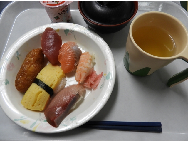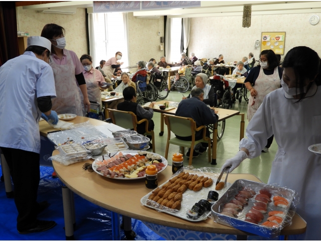 2月26日(水)は毎年恒例の寿司バイキングでした。 新型コロナウイルスの影響により、面会者はしばらくご遠慮させていただくこととなり、職員とご利用者のみで開催しました。