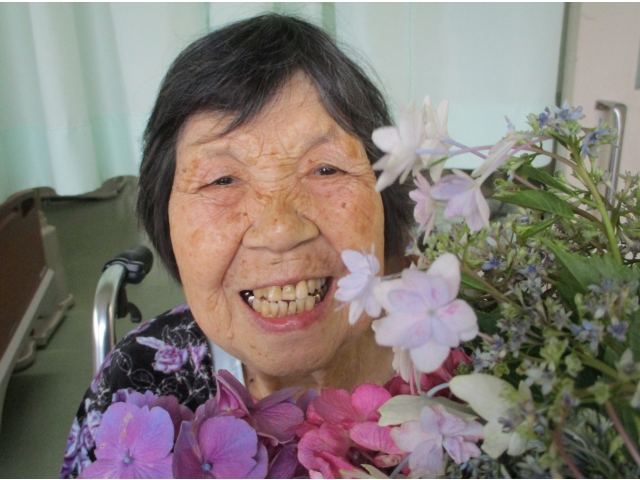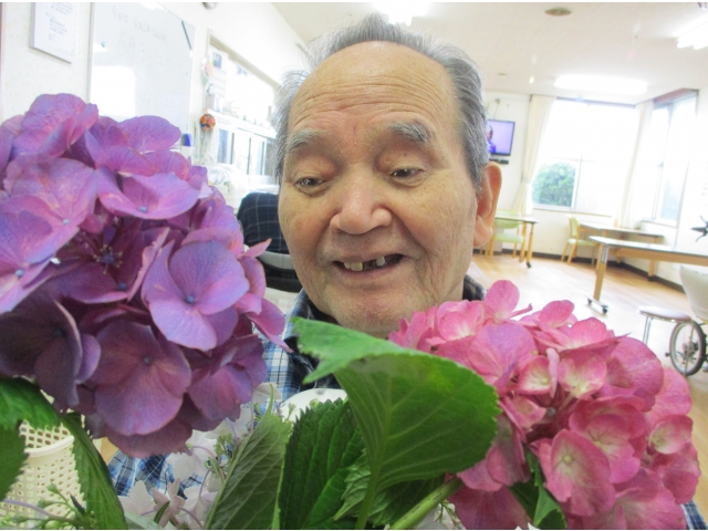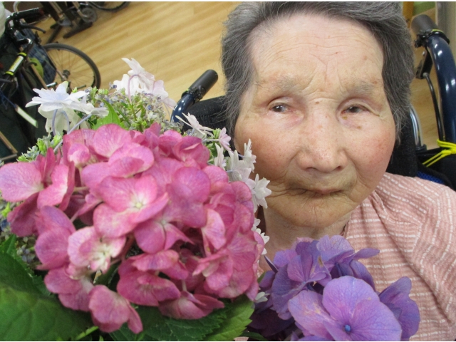紫陽花を抱えて、はい!ポーズ(^0^)v花に負けない、満面の笑顔が咲き誇りました!コロナウィルスの影響でご家族になかなか会えない利用者様ですが、紫陽花の花ことばのように、「辛抱強い、深い愛情」をもって、元気で明るくお過ごしいただいております!