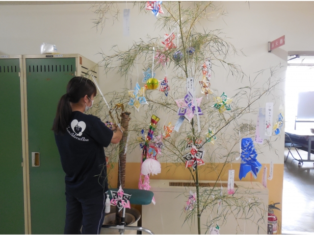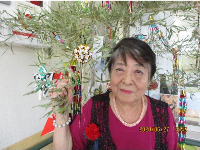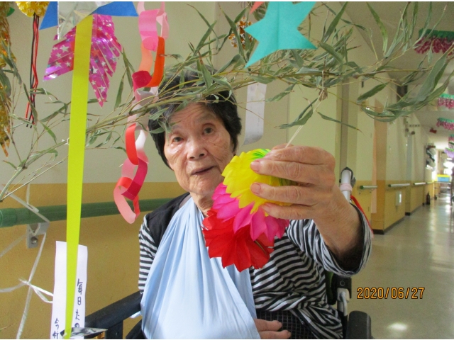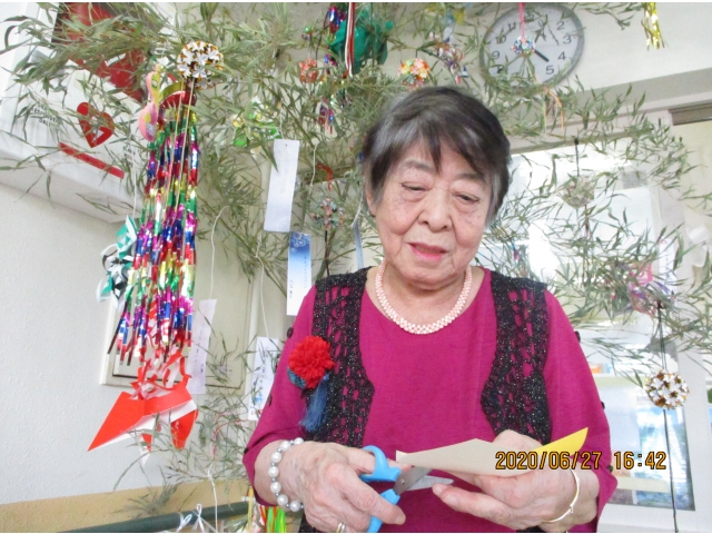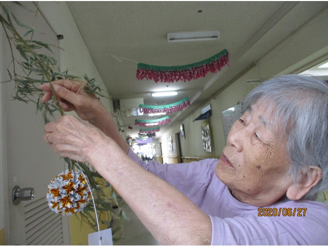 6月27日(土)佐屋苑では少し早いですが、ご利用者の皆さんと七夕の飾り付けをしました。 この飾り付けのために、以前からコツコツと折り紙で可愛い飾りを作っていただきました。