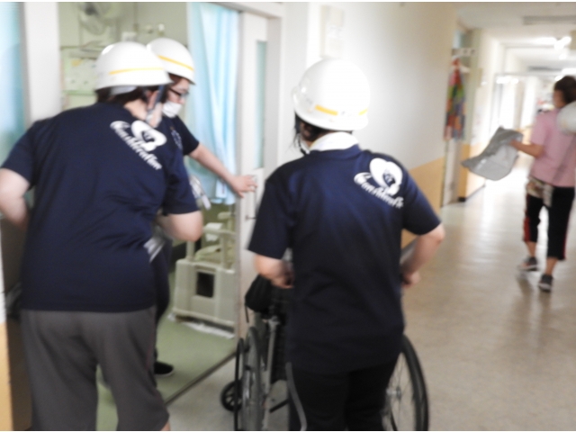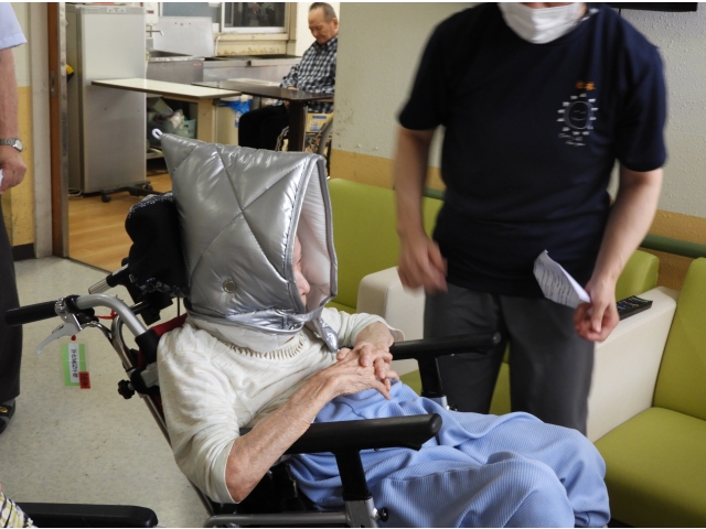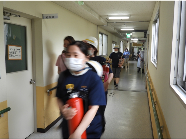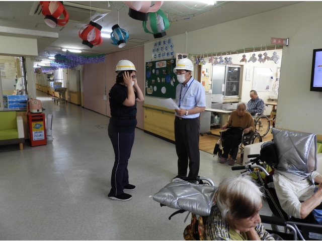 令和2年7月14日、3回目の防災訓練を利用者様参加の防災訓練(夜間想定の部分訓練)を行いました。西棟介護員室から出火し、第二避難所まで避難誘導する計画でしたが、雨天のため食堂前広場までの避難誘導を行いました。 夜間想定で職員が少ない中での初期消火・非常放送・避難誘導と計画通り実施できました。