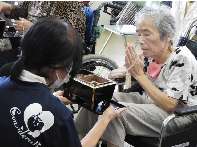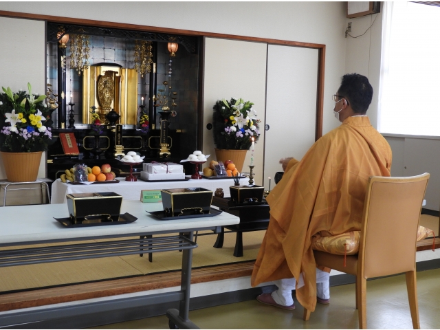 9月23日(水)に西照寺服部導師をお招きし、秋の彼岸法要が催されました。当日は、利用者の皆さんと出勤職員で焼香を行い、物故者の供養を行いました。服部導師様の読経から始まり、しめやかに執り行われました