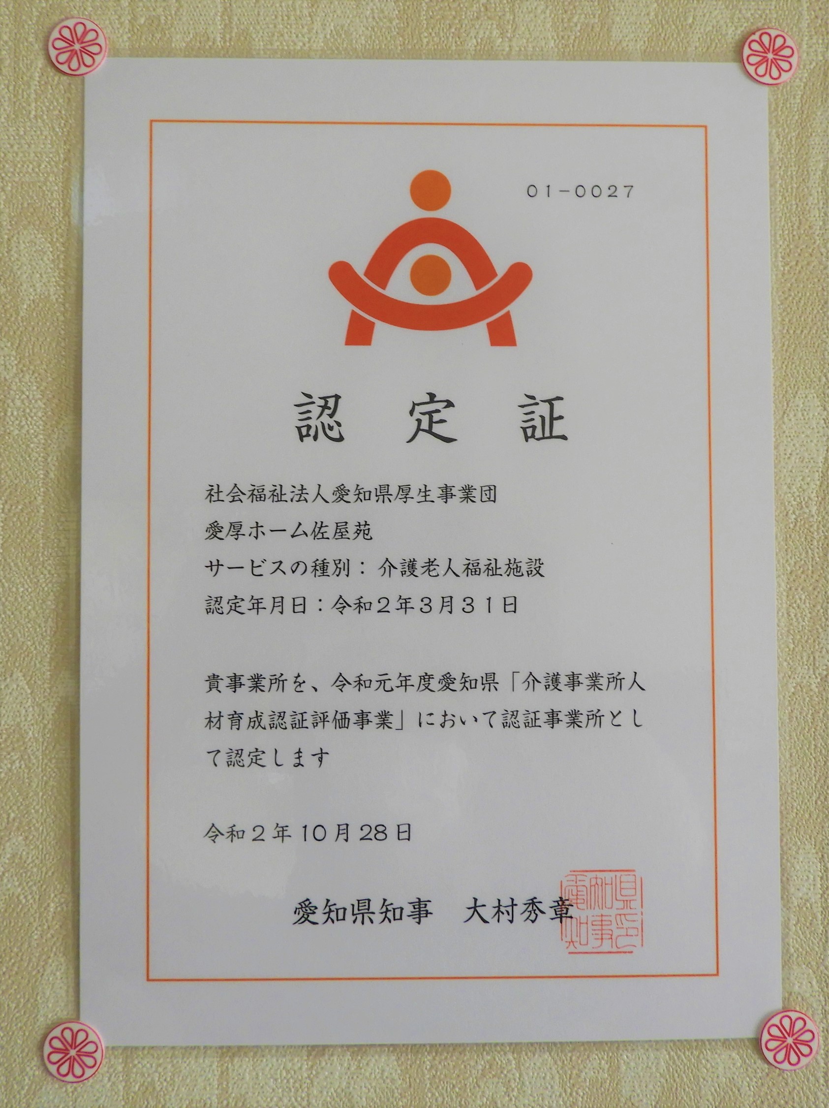愛知県が実施の事業で、当苑は平成29年度からの3年連続認証を受けました。例年は春に認証証の交付式がありますが、今年度は新型コロナの影響で10月28日に交付式があり、 服部愛知県福祉局長から頂きました。 今年度も評価事業受審を受けることとしており、さらなる連続を目指して人材育成と環境整備に努め、働きやすい職場が利用される方の安心・安全につながるとして努めていきたいと思っています。