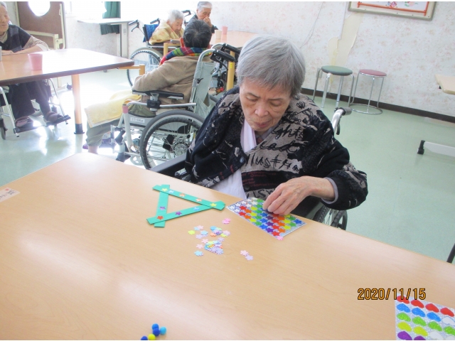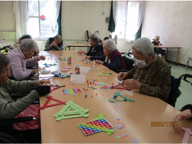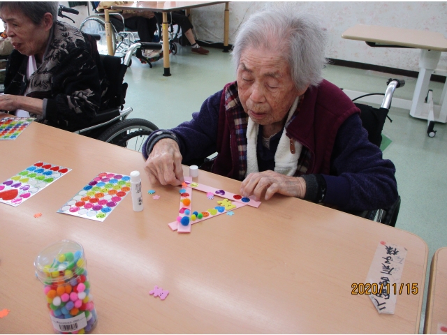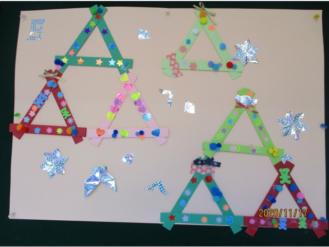 来月に備えて壁画のクリスマスツリーを作りました!皆様思い思いにシールやボンボンを貼り付けて、オリジナルのかわいいツリーを作成しました。