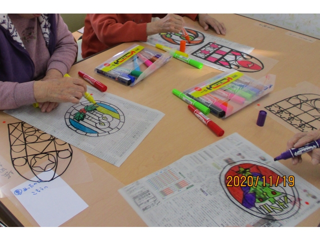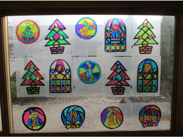 ステンドグラス風の飾り作成し窓に貼り、陽の光が差し込み素敵な仕上がりとなりました。