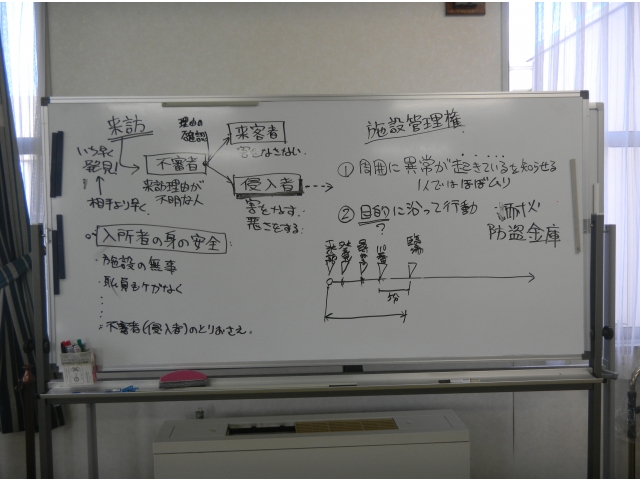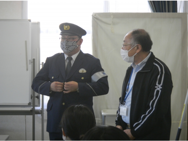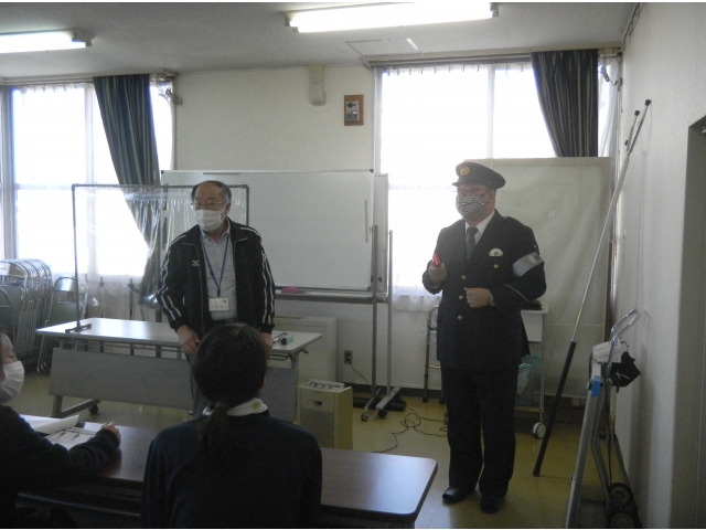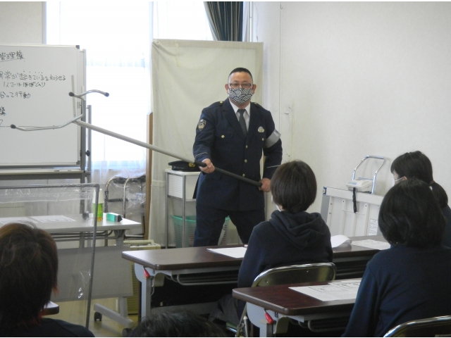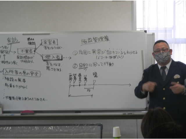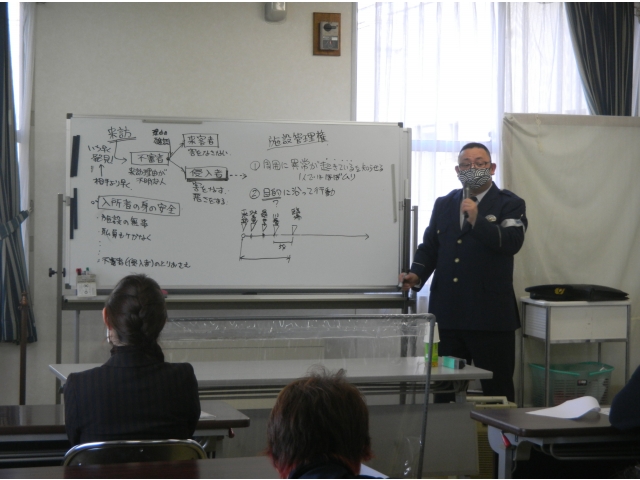 12月2日(水)午後1時50分より第7回防災訓練(防犯)を行いました。津島警察生活安全課巡査部長近藤氏を講師に招き、コロナ禍の中で講義形式にて苑内での不審者対応の方法などの講義を受けました。 早期発見・確認・より多くの人に知らせる・110番通報の順で対応をし、不審者の確保より利用者及び職員の安全第一を最優先にすることを学びました。
