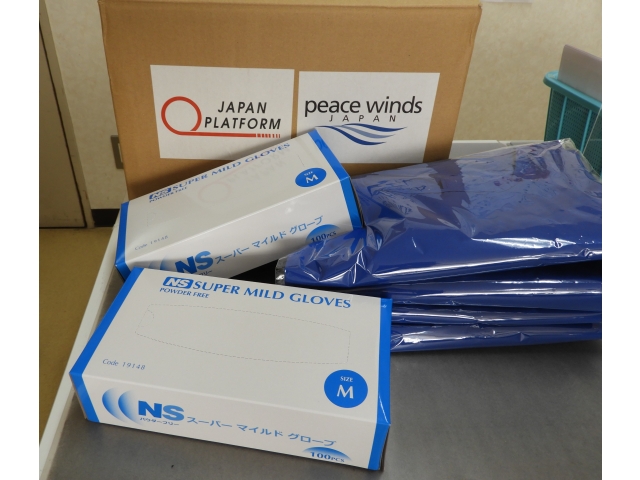 特定非営利法人 ピースウィンズ ジャパン 様より使い捨ての予防着に引き続き続きリリュースの予防着とビニール手袋 いただきました。