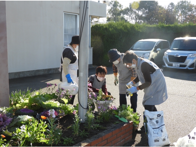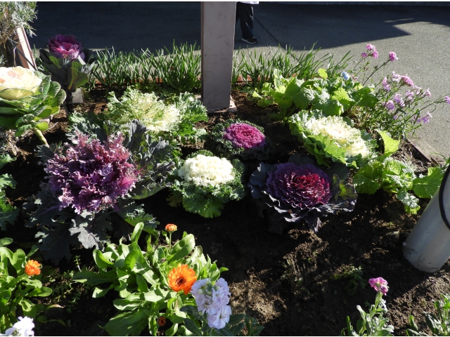 師走に入り空っ風の拭く寒い朝、みはるの会の皆さんがいろいろな種類の葉牡丹を玄関先の花壇に植えてくださいました!