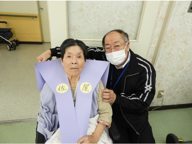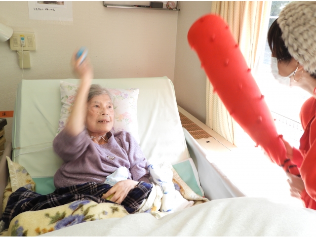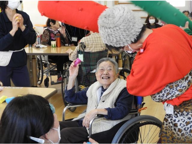 豆のかわりに紙で作ったボールで赤鬼・緑鬼に「鬼は~外、福は~内」と声が飛び交い、笑顔あふれ楽しい時間を過ごされました。
