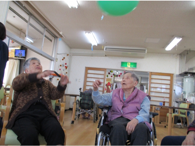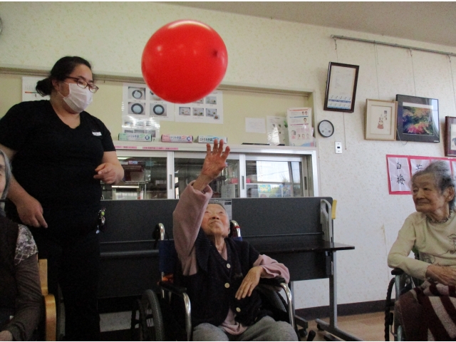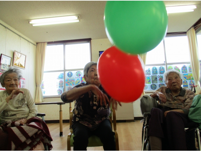 皆で輪になって大きな風船で風船バレーをしました!2つの風船を使ったため、1つの風船に夢中になっているうちにもう一つが頭の上に ポコン! なんてことも・・・声掛けあったり、失敗して大笑いしたり・・・心も体も元気いっぱいのゲームになりました!!