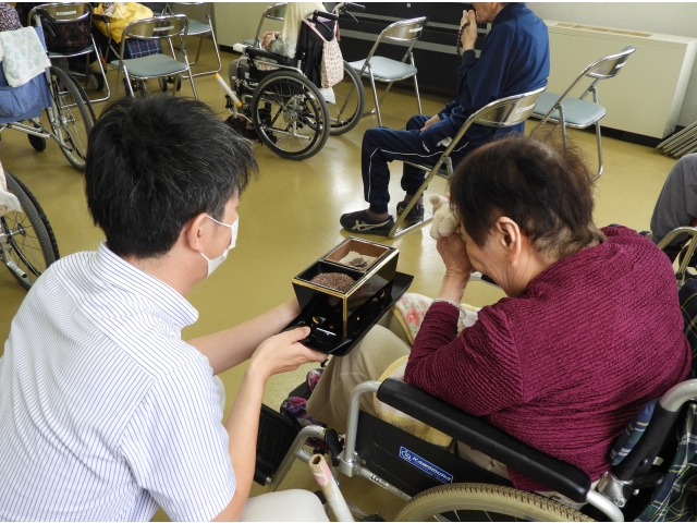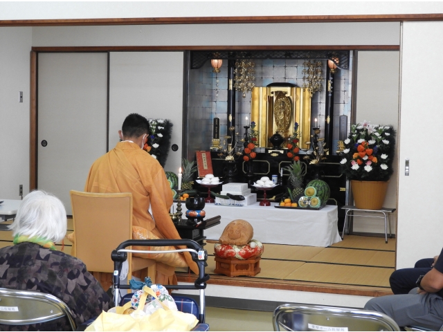 8月11日西照寺の服部住職によりお経をいただき、盆供養を行いました。当苑で亡くなられた方を始め、それぞれのご親族を想い皆さん手を合わせてみえました。職員と利用者様でお焼香をし拝みました。
