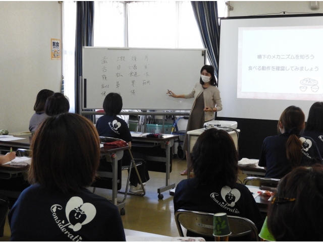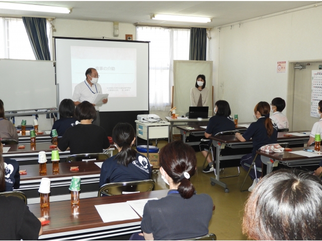 9月29日今年度本団での研修講師をされた、日本福祉大学中央福祉専門学校”森 由香子氏”により食事ケアの研修を行いました。 食事は利用者の一番の楽しみである反面、誤嚥による肺炎等危険も多くあります。自ら食べ物を食して、そのメカニズムを知り基本を理解することで、安心した介助ができるものであり、わかりやすく理解も進みました。 今回受講できなかった職員にも、個別に正しい介助方法を伝えていき、全体のレベルアップにつなげていこうと思います。