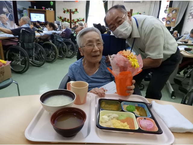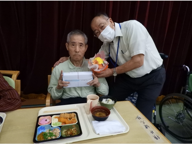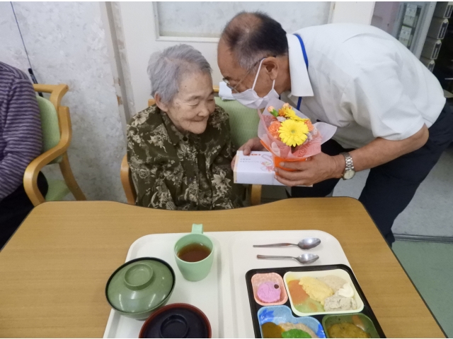 誕生会では、苑長から花束とプレゼントが贈られ、とても嬉しそうな笑顔が見られました(^^)