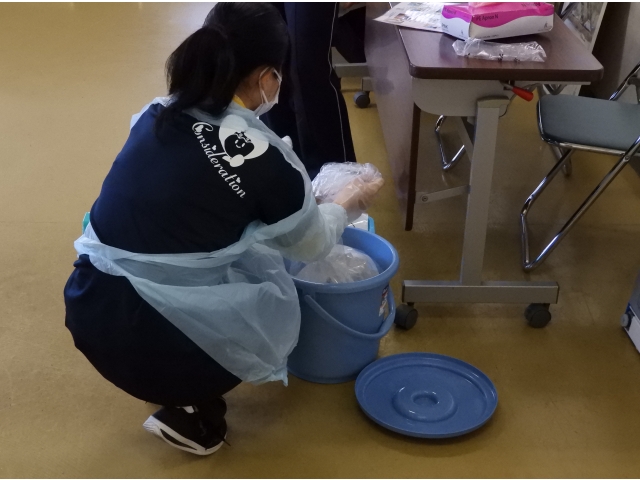 10月20日介護員会議の後、感染症担当介護員により施設内数か所に置いてあるセットを使用し、確認研修を行いました。時々、復習をすることで必要時に的確な行動がとれるようにしたいと思います。