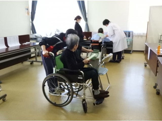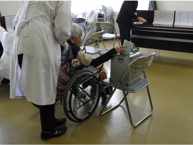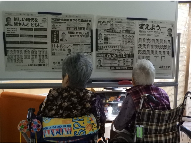 10月27日 衆議院議員等の不在者投票を苑内で行いました。立会者として愛西市の総務課より課長さんと主任さんが来られ、管理者を苑長として、不在者投票を行いました。3種類の投票を希望された訳割の利用者の方が、真剣に選び複数職員の介添えのもと、投票されていました。