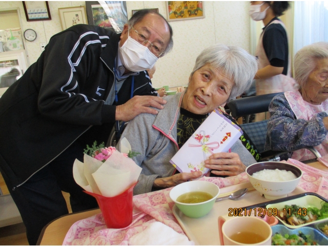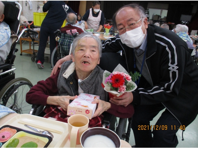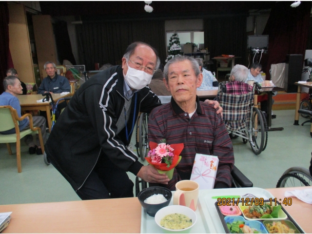 本日は誕生会が行われ、12月生まれの利用者のお祝いをしました。8名の方が誕生日を迎えられ、中には今月で100歳を迎えられるかたも見えました。誕生日を迎えられる利用者のリクエストにより、昼食は油淋鶏、海老と青梗菜の炒め物、春雨サラダと、中華料理が提供されました。