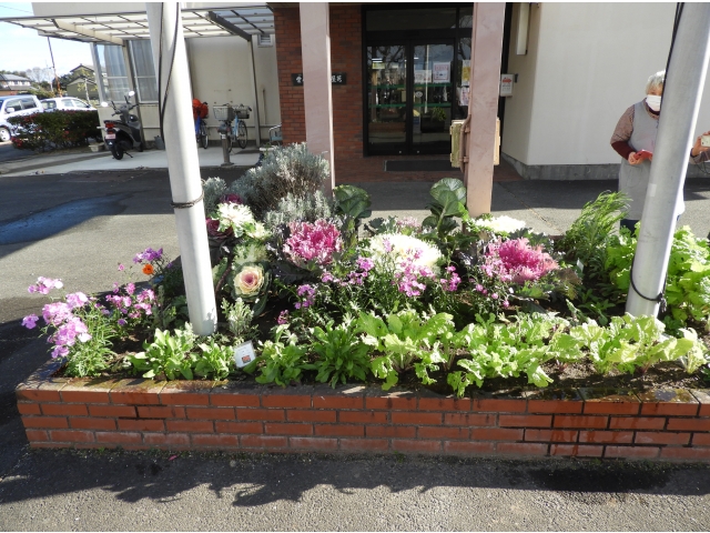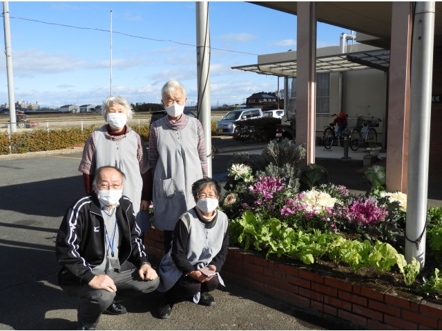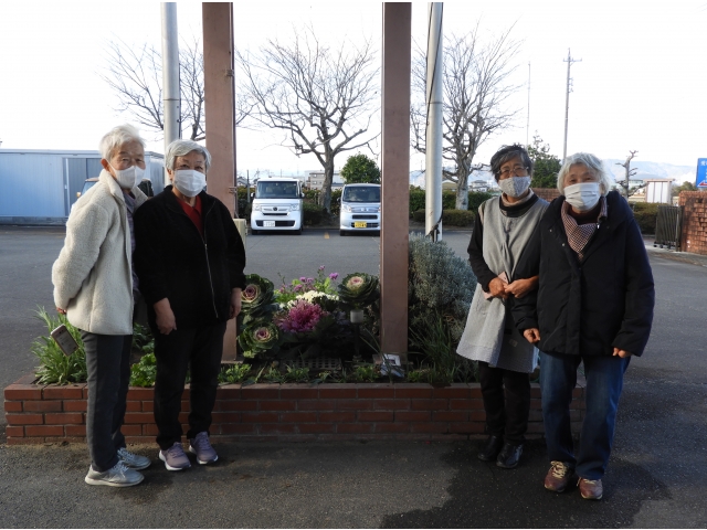 12月13日 花壇ボランティアの「みはるの会」4名で葉ボタンを始め、手入れをしていただきました。今年は気候にも恵まれ、立派な葉ボタンを植えていただき会員の方と記念写真を撮りました。今の佐屋苑では最後の正月を迎えることもあり、より力を入れてくださいました。