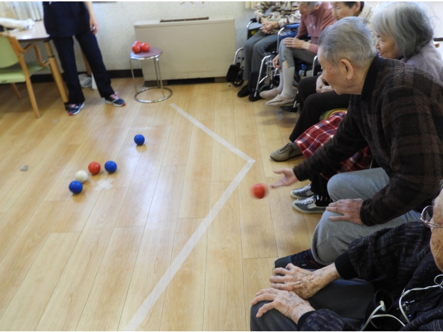 ゲームは3名ごとのチームを分けて行いました。はじめのうちは自分のボールをジャックボールへ上手く寄せられない事や、ルールを理解することが難しい利用者さまも見えました。しかしゲームを重ねていくうちに、力加減を調整しながら投球を行うなど一人ひとりが楽しんで参加していただけました。