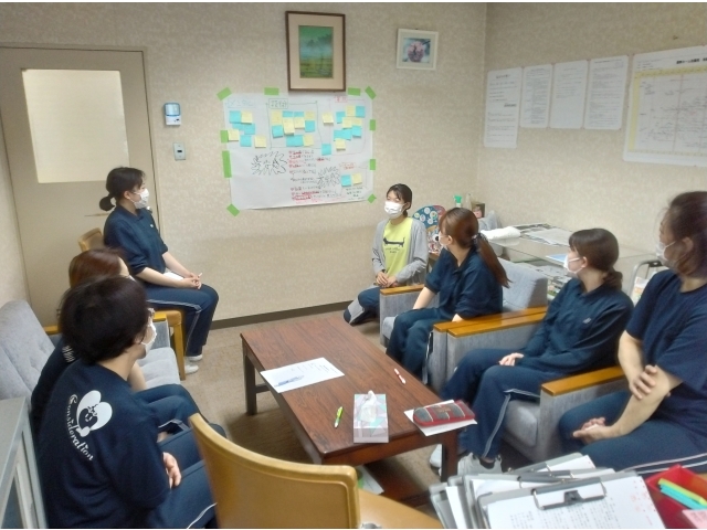 5月18日(水)介護研究会”笑”の黒田敬氏を講師として、4月初旬に続き1か月半経過した状態を踏まえてOJT受講者・指導者を対象として研修を開催しました。受講者は特に新規採用者で、これまでダブル勤務で学んできたことからの1人立ちに向けて、また指導者は教え方と受講者の成長など、それぞれ良い点を評価しながら今後の取り組みを確認できる機会になりました。次回は、半年後を予定しています。大切・丁寧に人を育てたいと思っています。