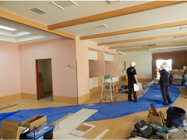 6月9日 リクルーター担当職員と現在当苑で実習中の学生さんと、工事状況を見てきました。フロアーのカラーはすべて出来上がり、多床室・個室も南フロアから→中→北へと順調に完成しつつあります。吹き抜けの交流スペースも、2階からの眺めも良く居室からの景色もなかなかのものでした。来月の完成が楽しみな、この頃です。