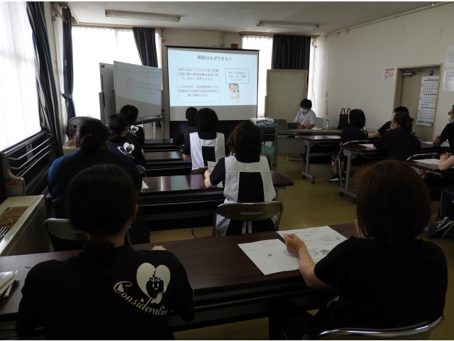6月22日、当苑の野呂理学療法士を講師として、看護・介護職員対象で行いました。 褥瘡ができる過程やできやすい部位の基礎から、正しいポジショニングと対応など、利用者の方でできやすい方の実例を入れながら、わかりやすく説明を受けました。 実際に行動に移すことで、褥瘡が出来ている方は早い治癒を、又、できないようにと心新たにできました。 とても相談しやすく、勉強になりました。