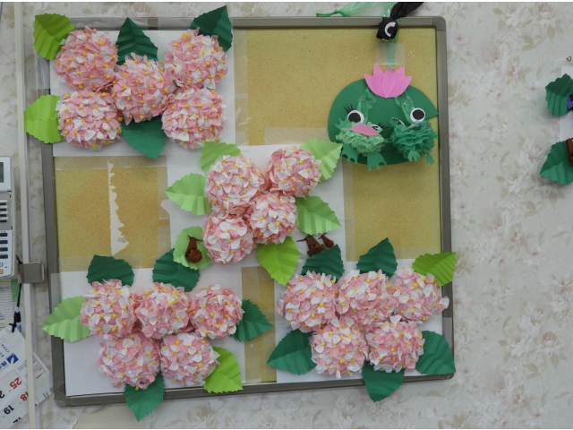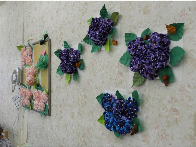 また、レストランには梅雨の季節から「あじさい」などの飾りを作成しました。 毎月季節にあった飾りを工夫して、利用者さんと一緒に作成しています。 さて新しい施設ではどうしようか、検討中です。