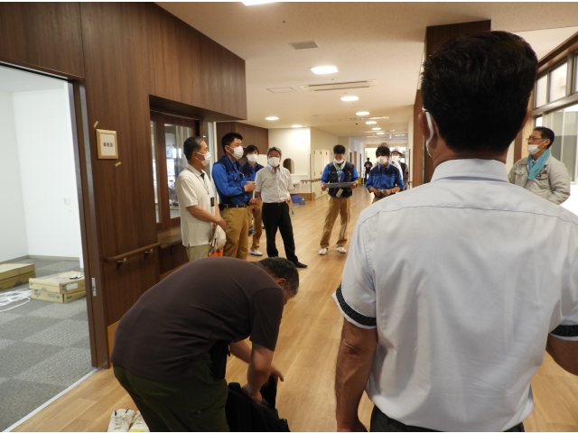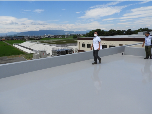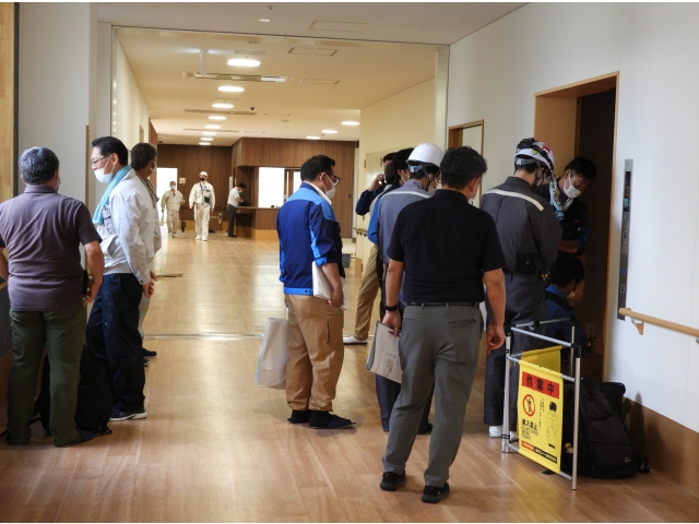 7月6日8時45分~18時30分、事業団から3名、佐屋苑から2名、設計事務所及び工事担当者で屋上から建物内及び外部まで、検査を行いました。 不具合が指摘されたところは7月15日までに修正し、再度確認検査を行い、20日の引き渡しに備える予定となっています。 屋上からの眺めは良かったですが、非常に暑く体力を消耗しました。