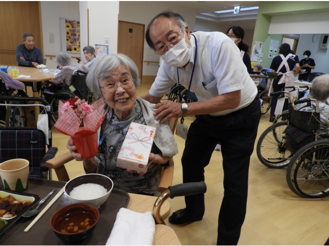 8/18に、新施設では初めての誕生会を行いました。 食事メニューは、☆味噌カツ☆鶏しんじょうの炊き合わせ☆えびアスパラのサラダ☆すまし汁☆祝いまんじゅう 今月は10名の方が誕生日を迎えられました。 これからも元気にお過ごしください。