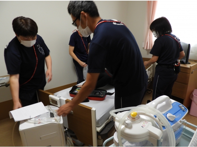 10月5日 改築後施設環境が変わったこともあり介護職員の緊急時対応について、主査を講師として実施をまじえて行いました。 発見から吸引器・酸素・AED等の準備と、模擬実技を夜勤4名の役割を基に交代して行いました。