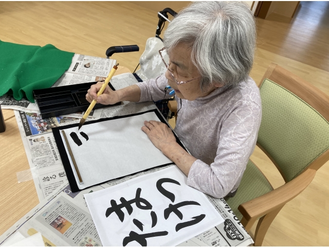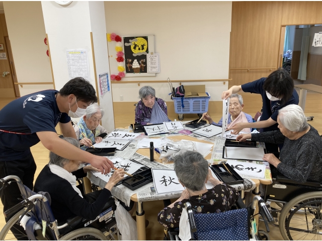 北町にて習字をしました。みなさん、お好きな文字を書かれました。「手がうまく動かないわ」と言われていた方たちも、とても上手に書けていました。朝晩の気温差だけではなく、文字を見てさらに秋を感じました。
