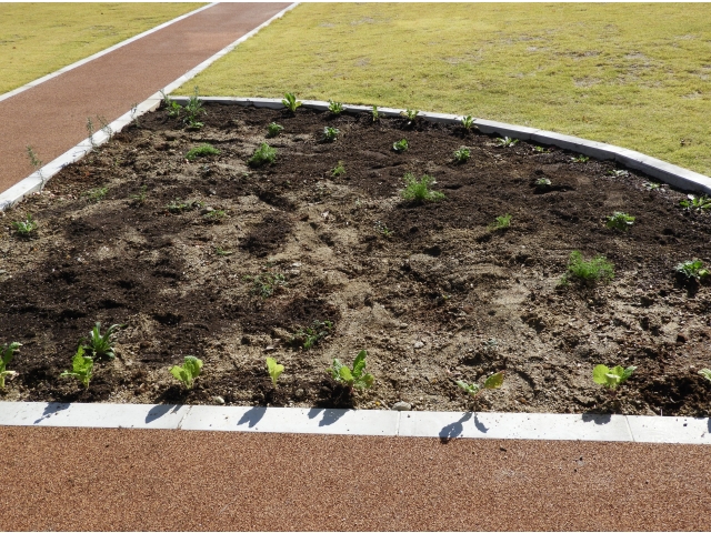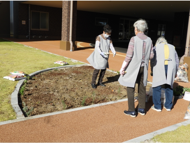 11月14日ボランティア「みはるの会」の皆さんに、竣工式に合わせて植えられていた花を春に向けての苗に植え替えをしていただきました。「桜草」「金魚草」「ベニジューム」など9種類です。色とりどりの花が咲くのが楽しみですね♪