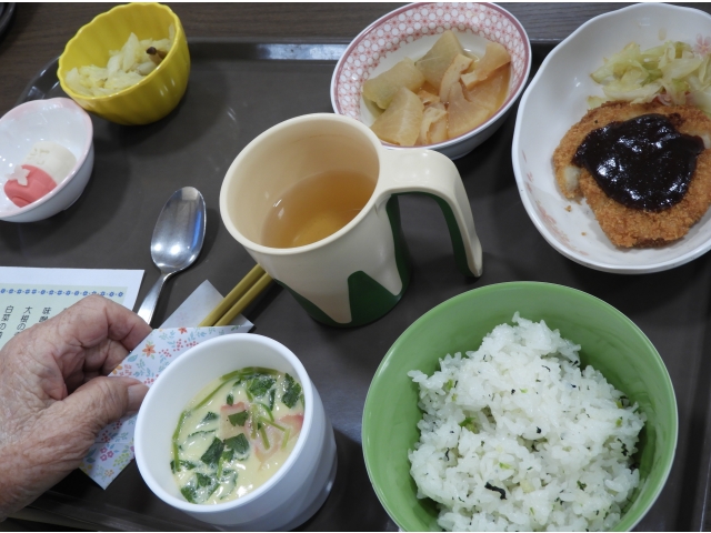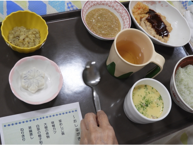 12/8(木)に12月の誕生会が開催されました。 誕生会の昼食メニューは、★菜飯★味噌カツ★大根の煮物★白菜の柚子和え★茶碗蒸し★ねりきり が提供されました。