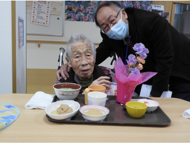 1月12日に1月生まれの方の誕生会を行いました。 今月は11名の方が誕生日を迎えられました! 昼食は、*かおりご飯*エビフライ*じゃがいものそぼろ煮*きゅうりのごまポン酢和え*茶碗蒸し*ねりきり でした♪
