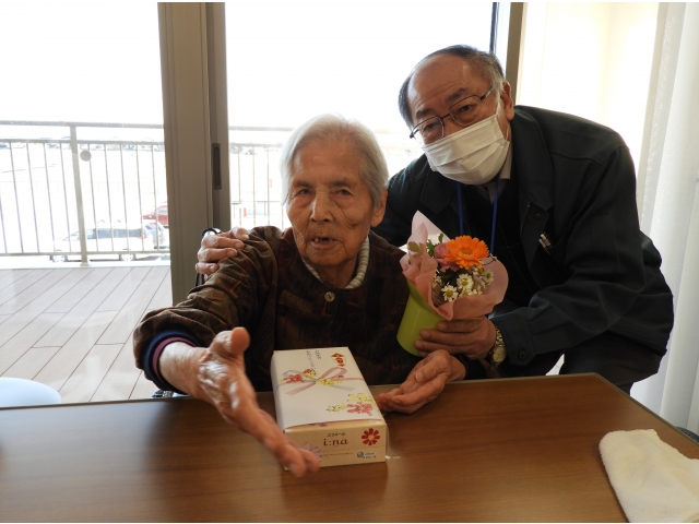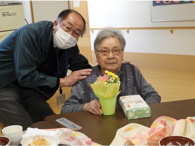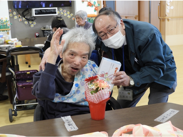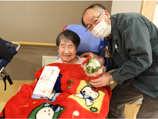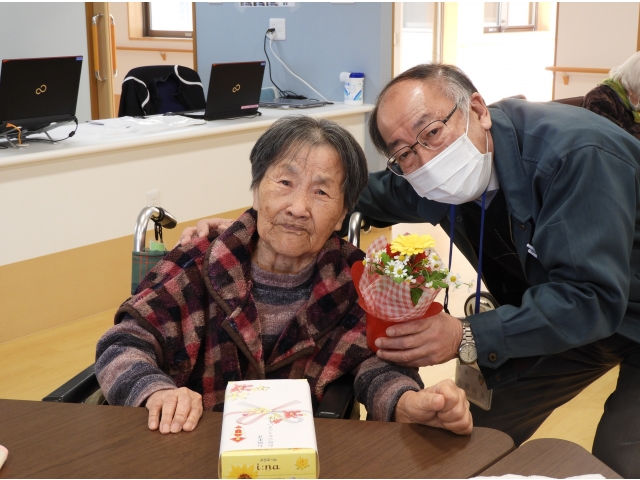 苑長からお花とプレゼントが贈られ、他の入居者様からも