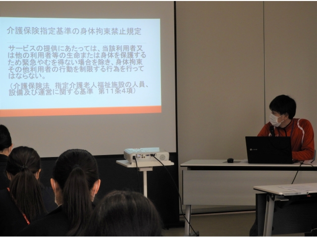 3月1日、当苑の畔栁主査を講師として身体拘束について再確認をしました。毎年、苑でもアンケートを実施しており、疑問点を解説するなど全員が意識し注意しあえる職場風土の大切さを続けて言いたいと思います。