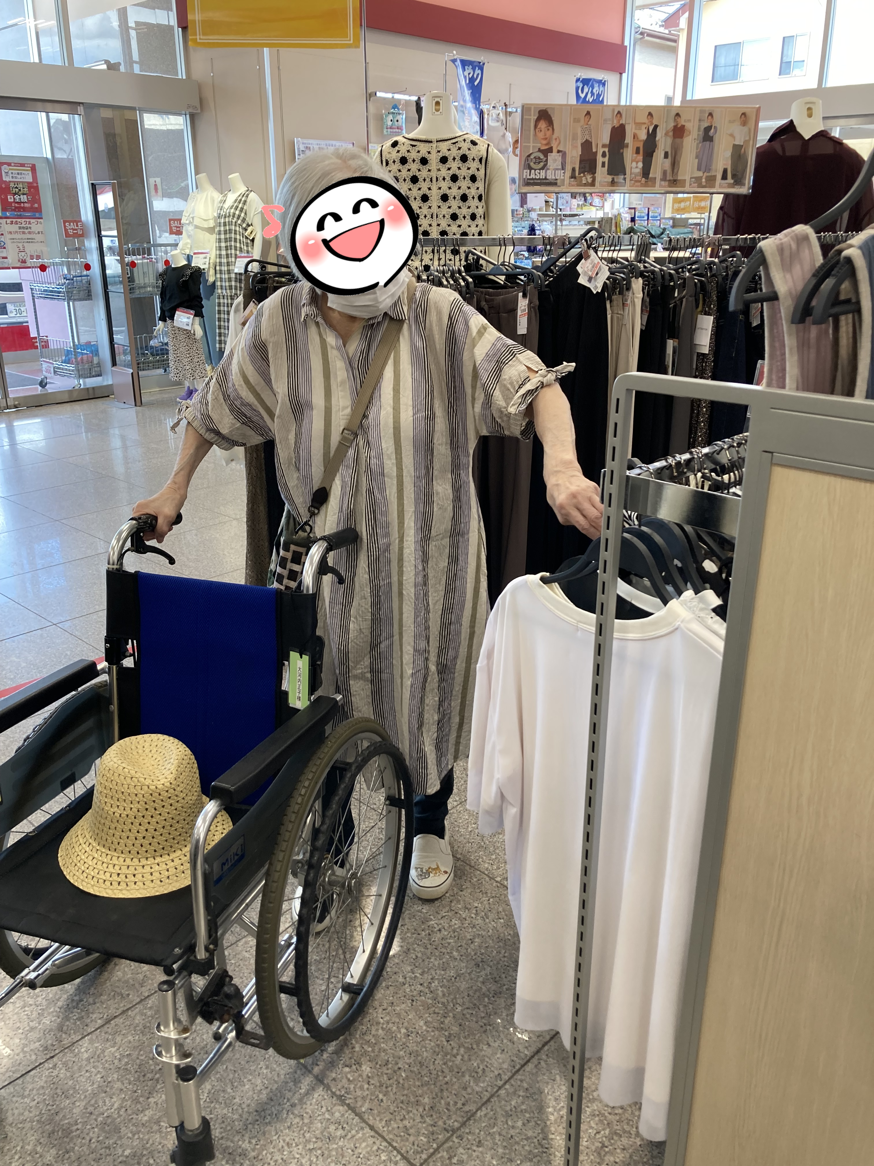 8月2日(水)室内への苑外外出が久しぶりに再開されました。コロナ後始めてのお買い物とあって、出かける前から何を買おうかワクワクドキドキ!お店について感染対策のマスク・手指消毒をし、いざ店内へ。「しまむら」さんで洋服を見たり小物を見たり久々の買い物を楽しみました♪