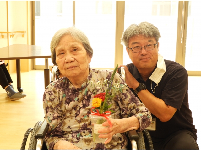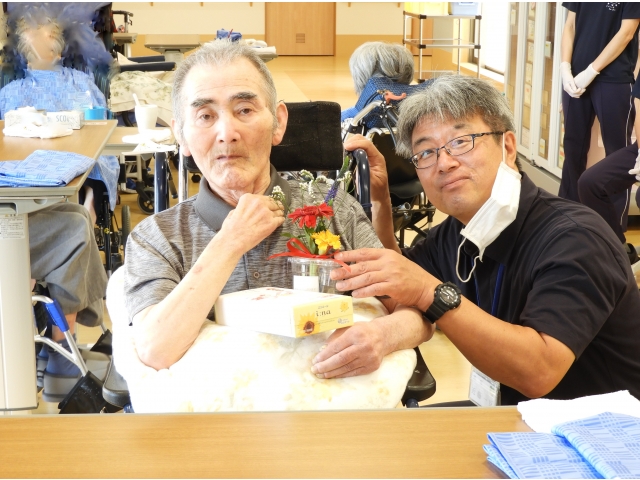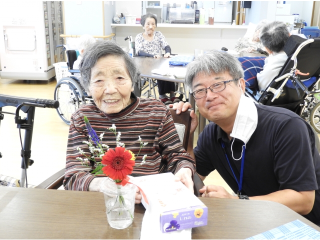 8月10日(木) 8月の誕生会をおこないました。 苑長からお花とプレゼントといただき、誕生月の方は笑顔で喜ばれていました。 職員やご利用者の皆さんに「おめでとう」と言われ、照れながらもニッコリ笑顔が見られました。
