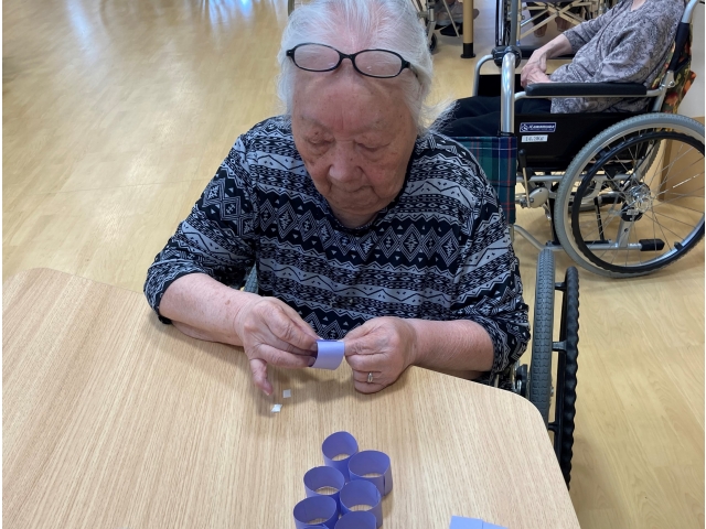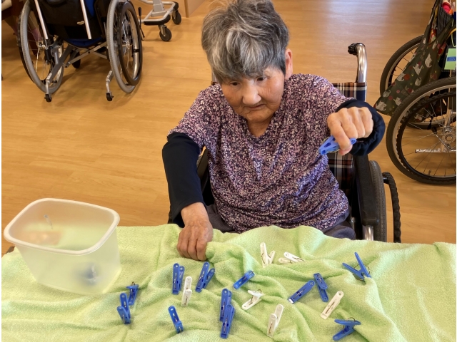 バスタオルについた洗濯ばさみを茶畑に見立て「茶摘みをしましょう~」と介護員の掛け声で、洗濯ばさみを摘んではケースの中へ。