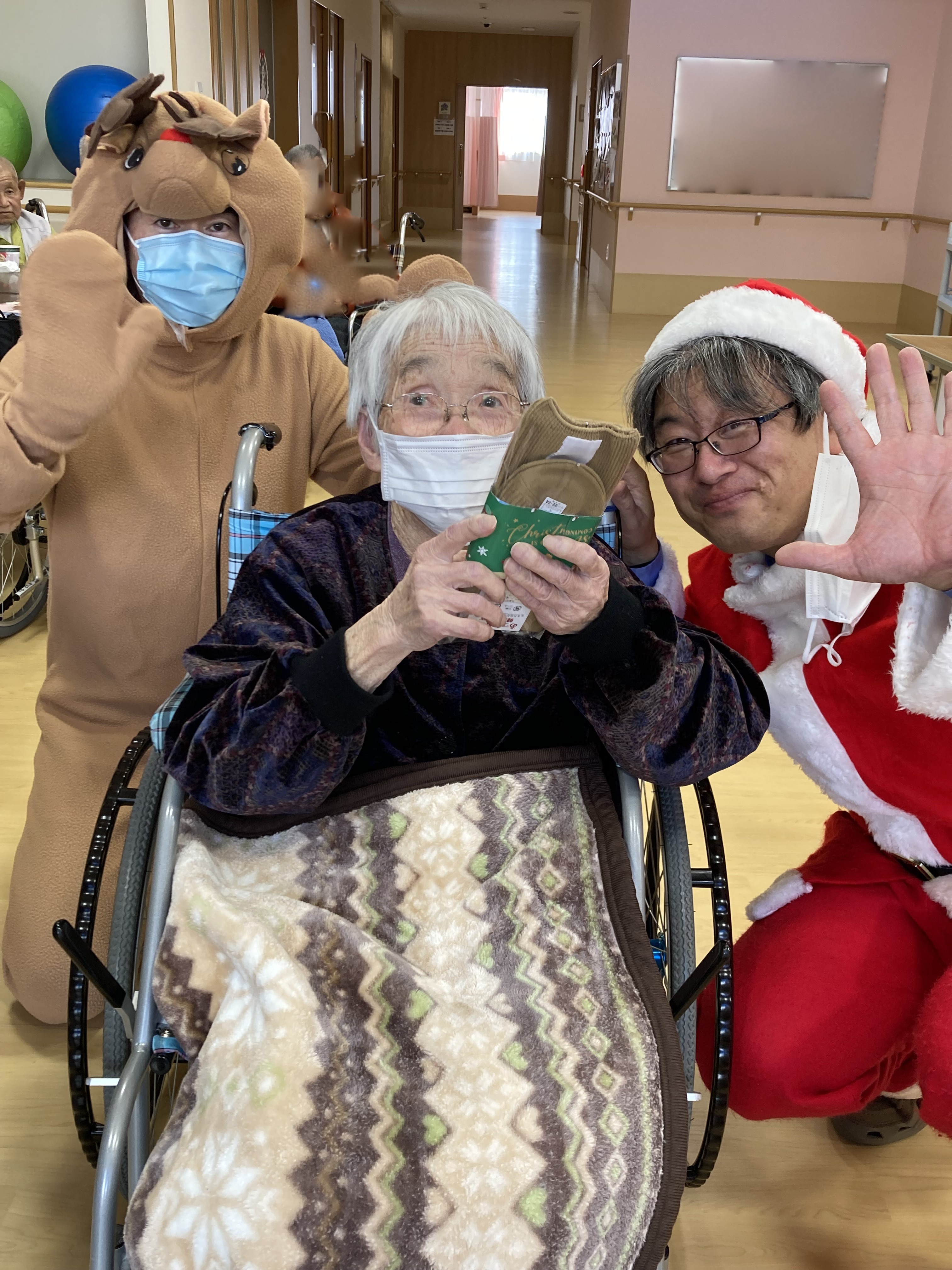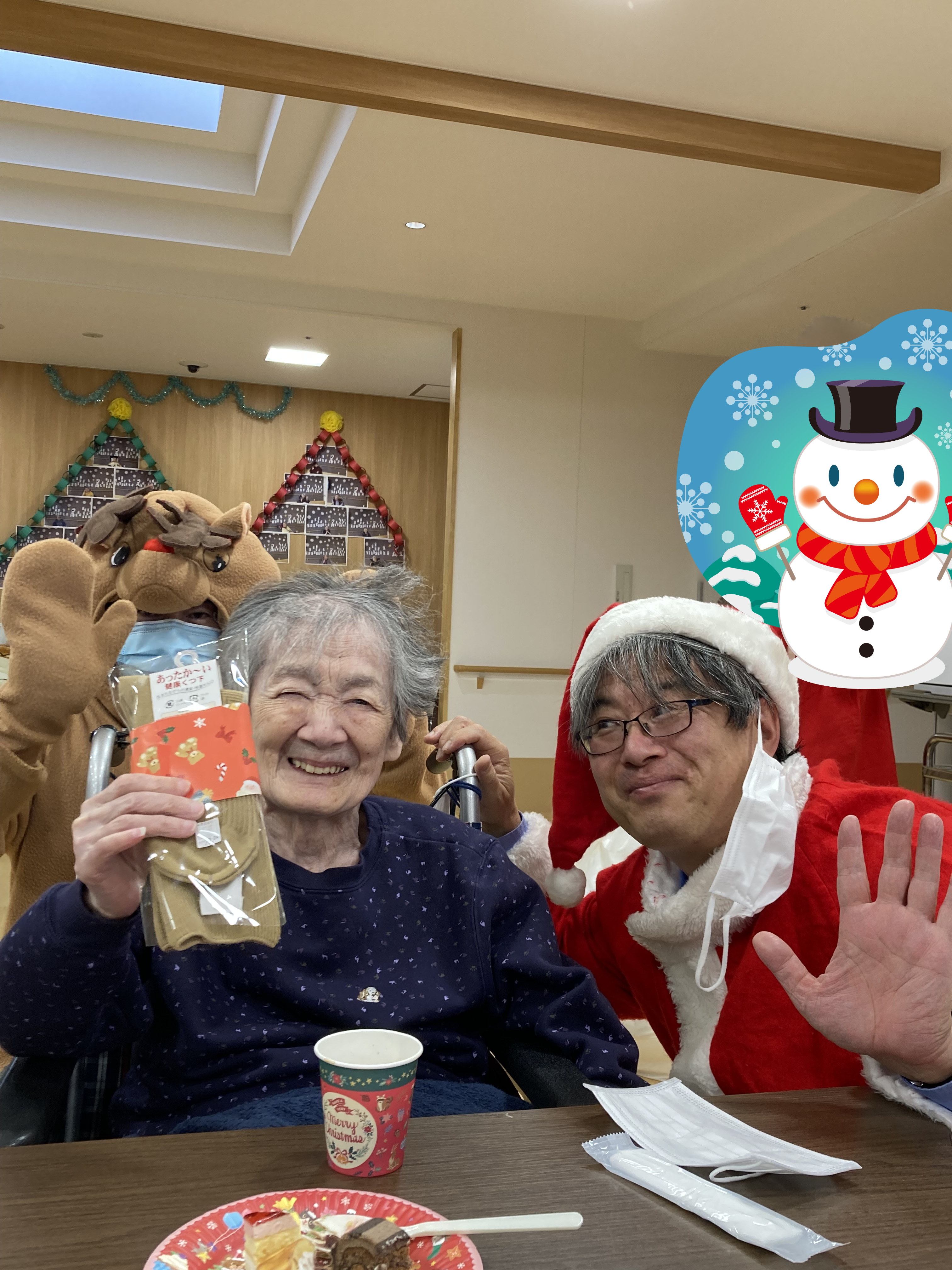 サンタさんは人気者で、ご利用者から「こっちに来てぇ~」とあちこちから声があり、サンタさんとトナカイさんは、大忙しでした。