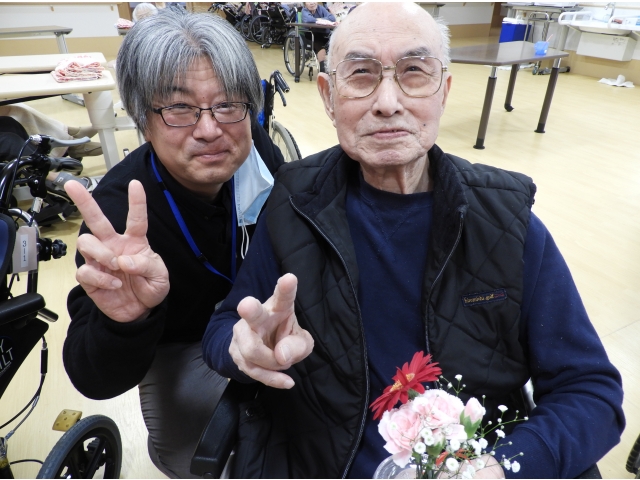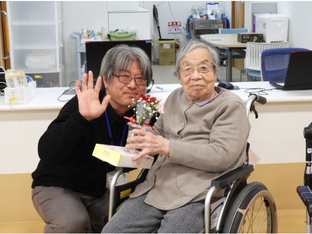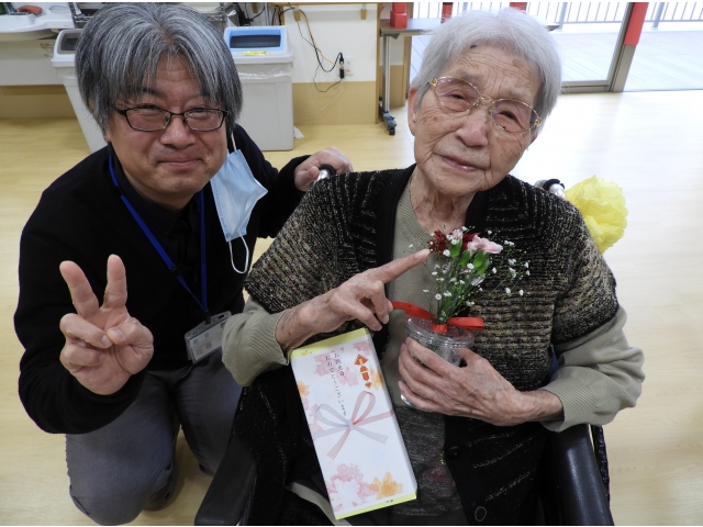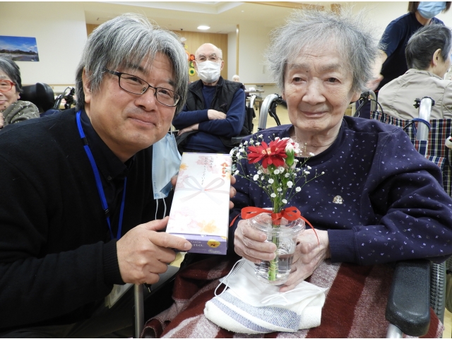 1月11日(木)今年初めてのお誕生会を開催しました。 誕生月の皆さんにお花とプレゼントを「おめでとうございます」とお祝いの言葉と共にお渡しをしますが、苑長より声をおかけすると涙ぐむご利用者の方もいて、職員も貰い泣きをしてしまう場面もありました。