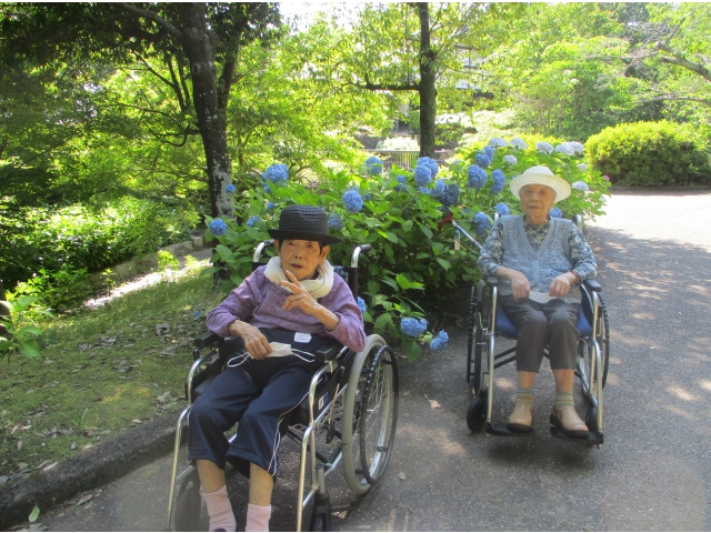 6月12日(水)木曽三川公園にでかけました。公園内にある、輪中の農家・水屋周辺に咲いている、あじさいをみにいきました。今年の梅雨は平年より遅れているため天気にもめぐまれ🌞太陽の光をあび、色鮮やかに咲くあじさいに「きれいだね~」と。木陰に入ると涼しく、きもちのいい苑外外出となりました。
