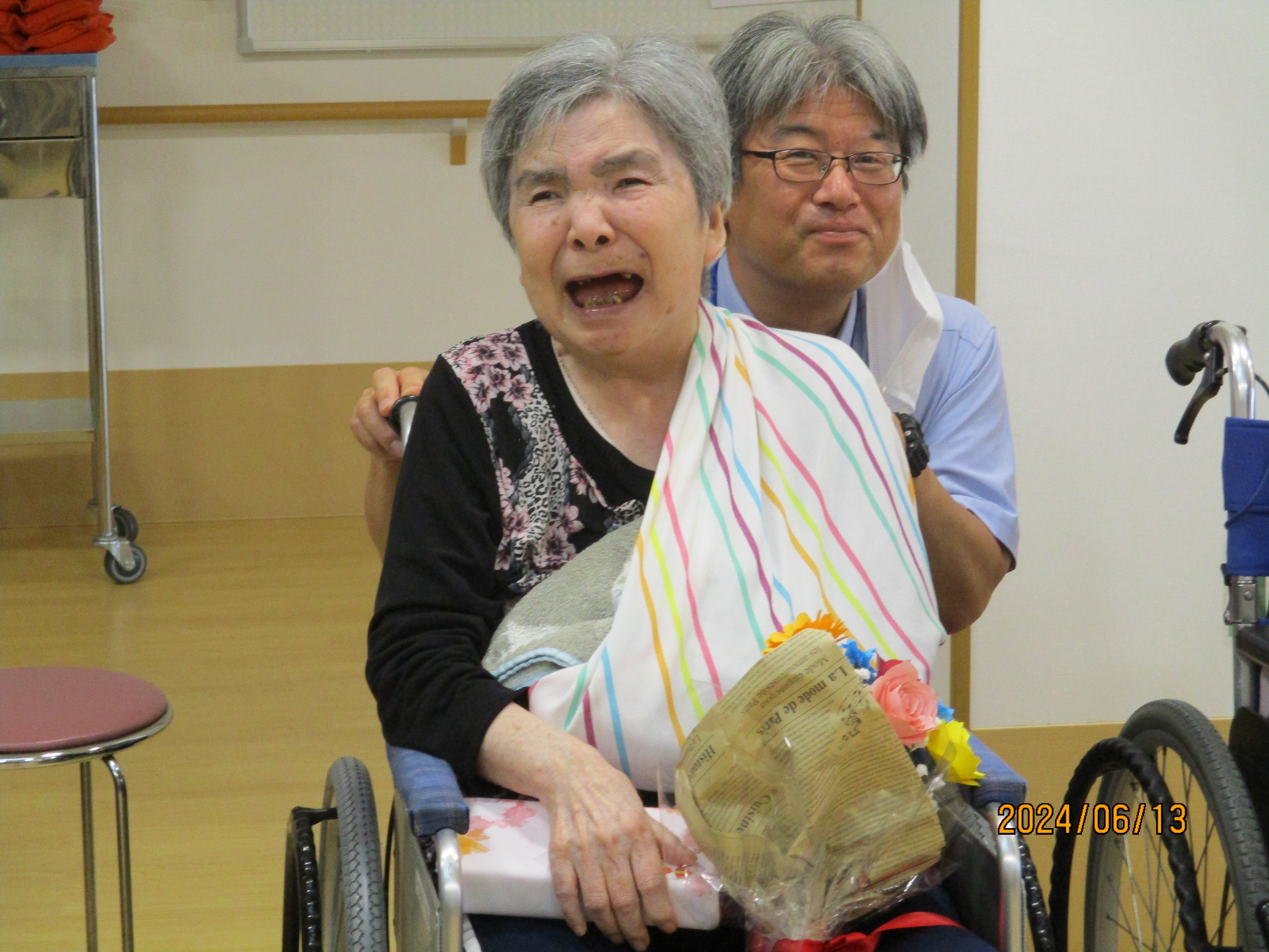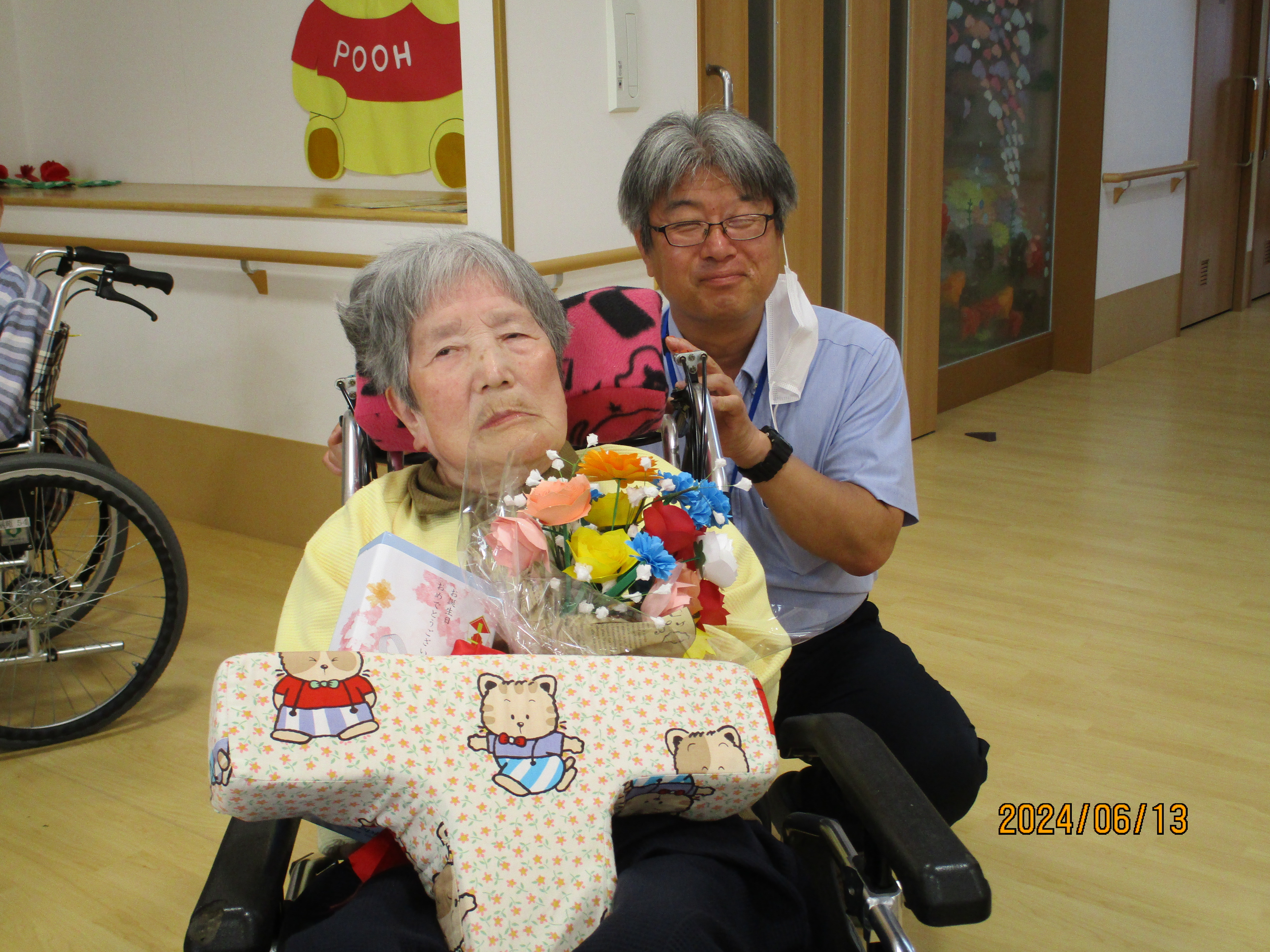 6月13日(木)に6月の誕生会を開催しました。佐屋苑では、7名のご利用者が6月に誕生日を迎えます。 苑長からきれいな花束とプレゼントを受け取り、どのご利用者様も素敵な笑顔が見られました。 6月生まれの皆さん、本当におめでとうございます。