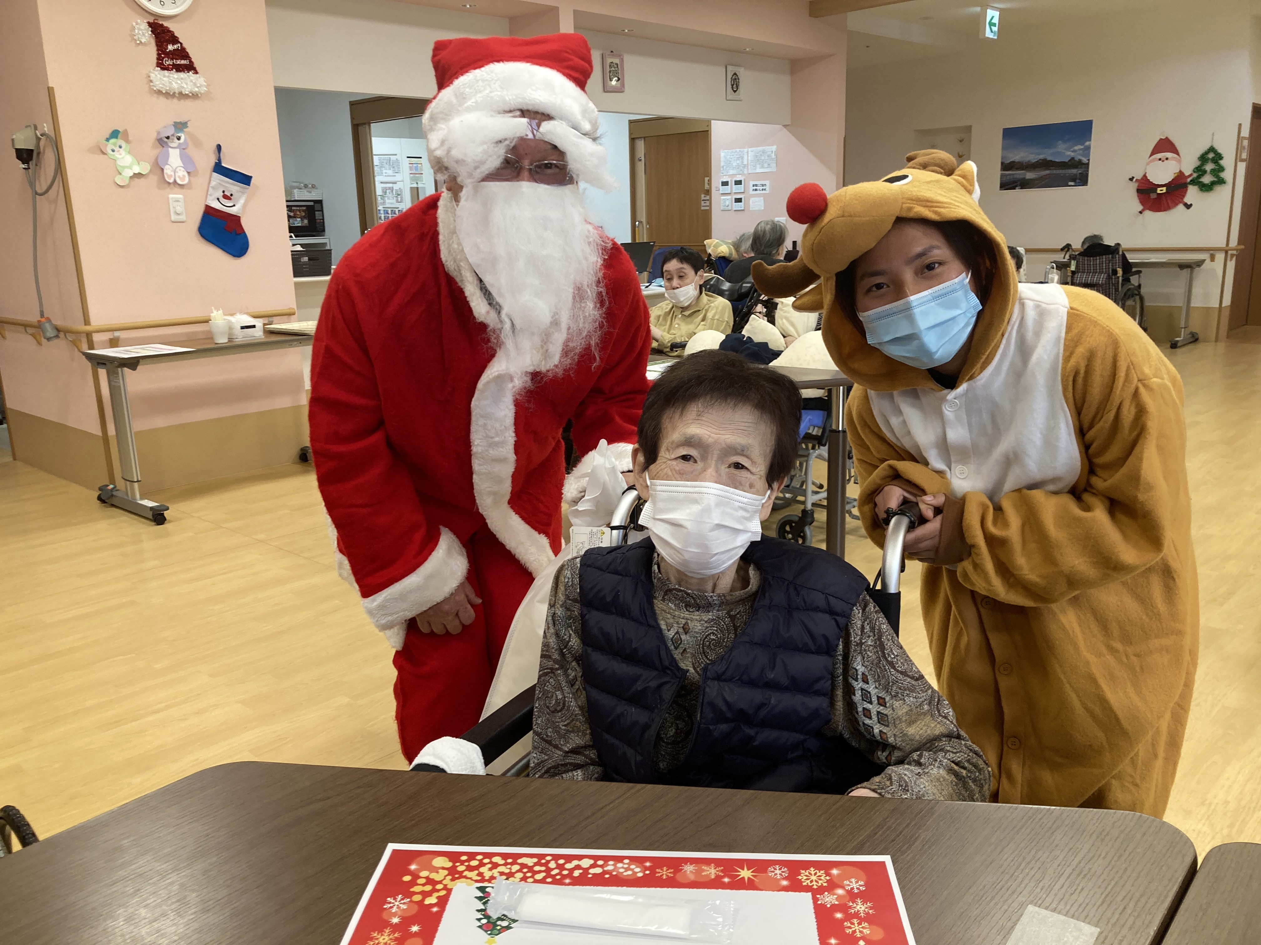 サンタさんからタオルのプレゼントを受け取り、トナカイさんとみんなで記念撮影をしました。