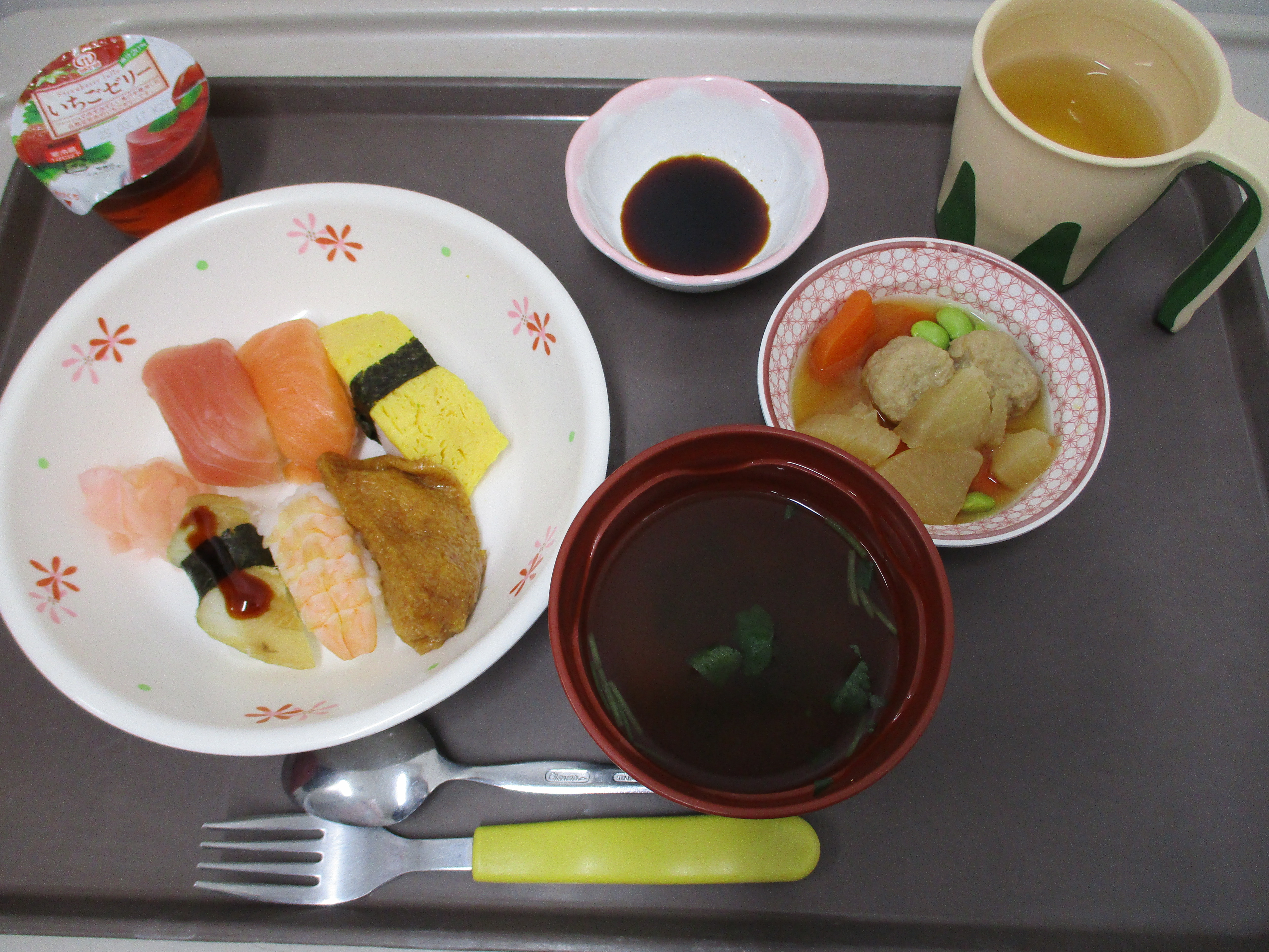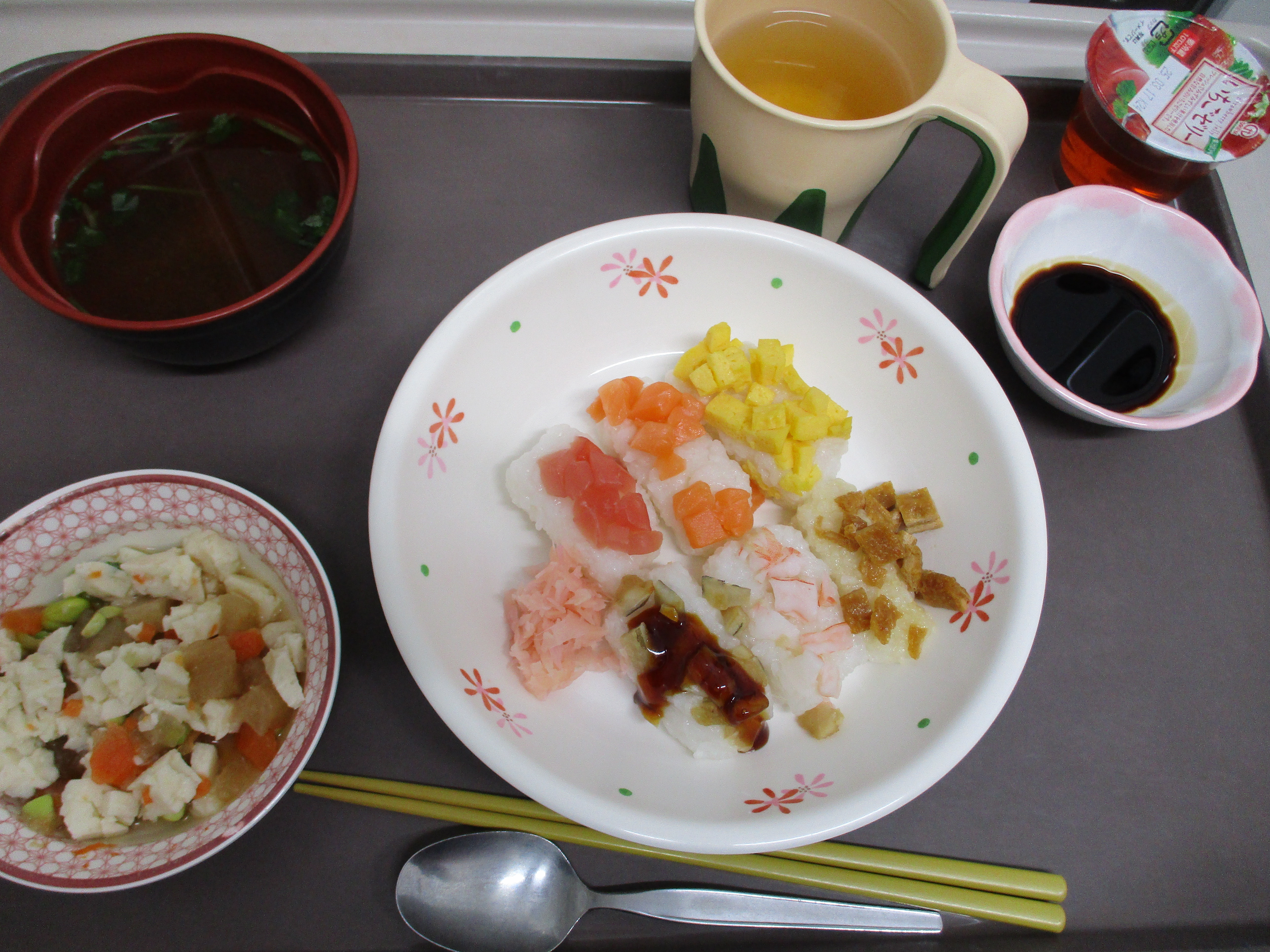 今回は給食委託会社と何回も試行錯誤をして飲み込みが悪い方でも食べやすいシャリ玉を作りました。 普通食が食べらない方もお寿司のようにお箸で食べる事ができ、「ここで寿司が食べれるとは思わなかった」ととても喜ばれていました。
